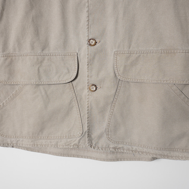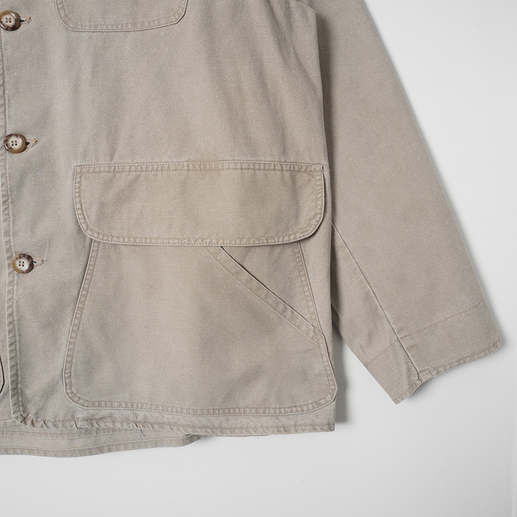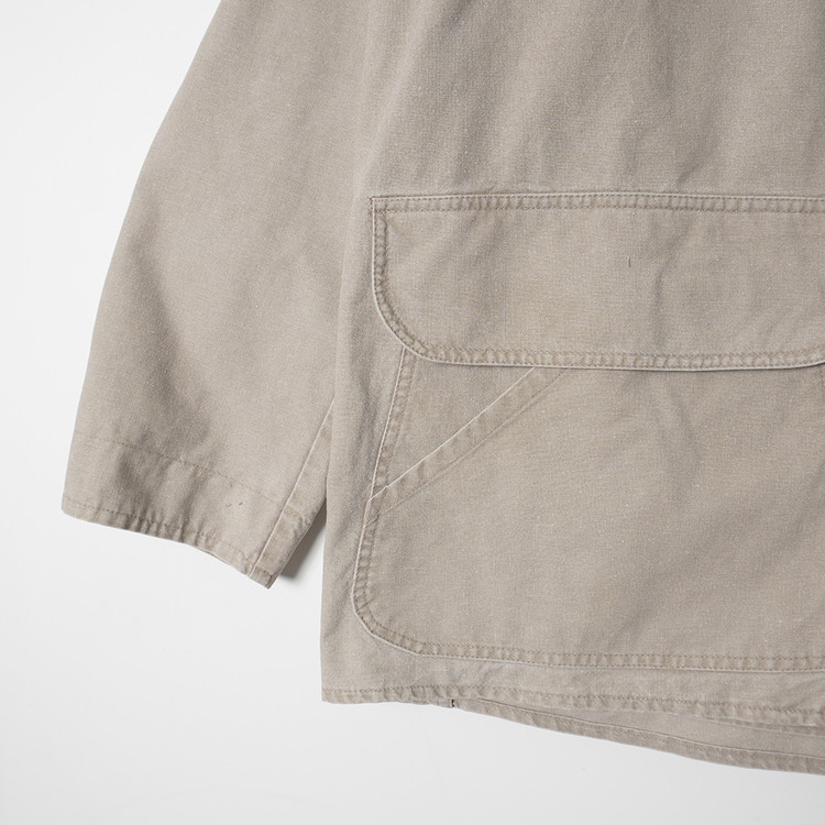두께감있는 탄탄한 코튼원단의 90년대 헌팅자켓입니다. 안감 라이닝 체크 패턴, 뒷면 탈착식 포켓 사양의 유니크한 디자인으로 취향에 따라 등쪽 포켓 탈부착 가능한 제품입니다. 자연수러운 사용감 외 특별한 오염/데미지 없는 우수한 컨디션입니다.