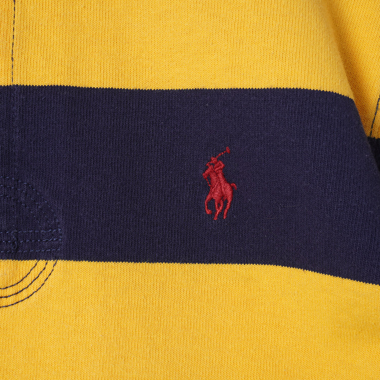 럭비셔츠 스타일의 롱슬리브 카라 티셔츠입니다. 네이비와 옐로우 배색으로 전체적인 컨디션 우수한 상태입니다.