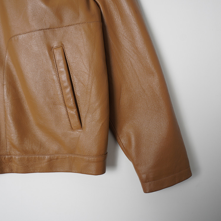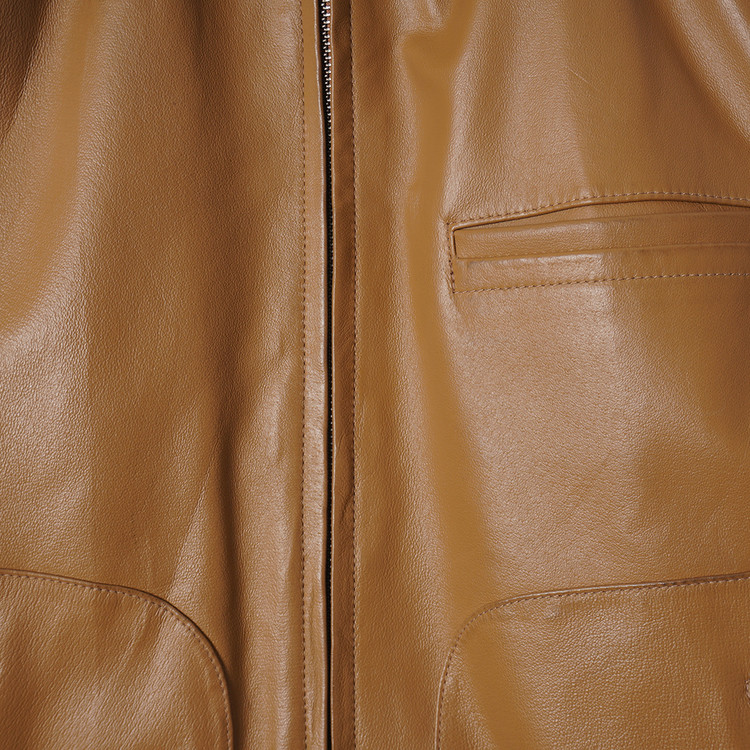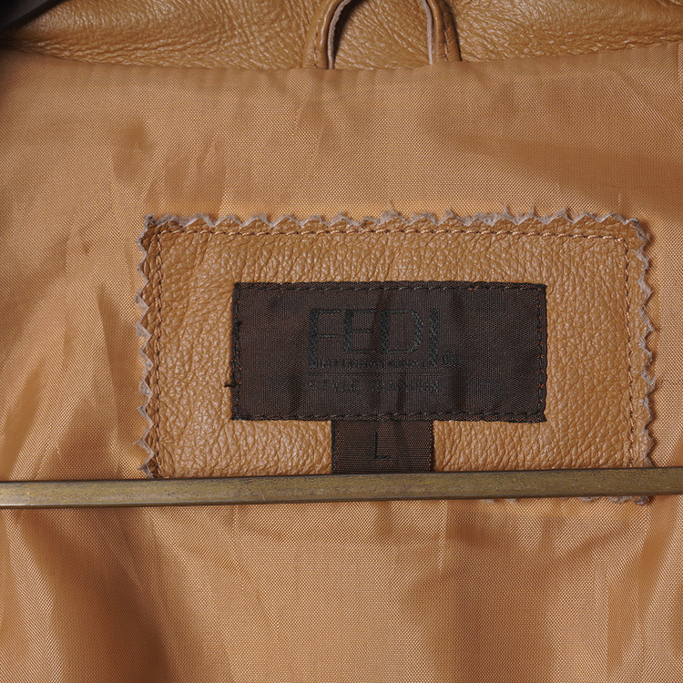 브라운 컬러의 돈피 가죽 집업자켓입니다. 소가죽 정도의 두께감과 질감의 제품으로 사용감 적은 우수한 컨디션으로 국내 남성 L 사이즈 추천드립니다.