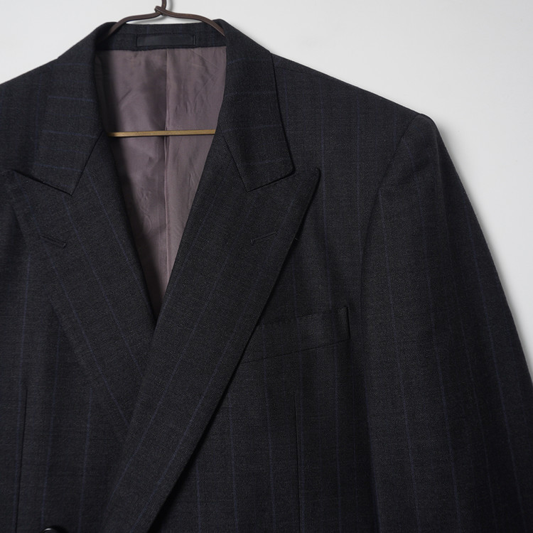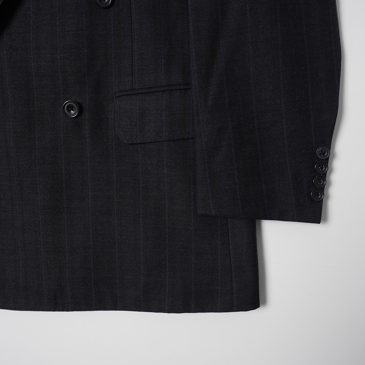 차콜그레이 컬러/핀 스트라이프의 울 더블브레스티드 블레이져입니다. 다소 각진 핏의 제품으로 국내 남성 M-L 사이즈 추천드립니다.