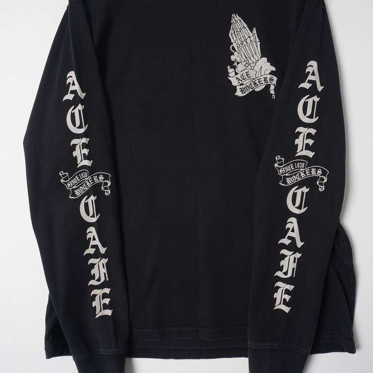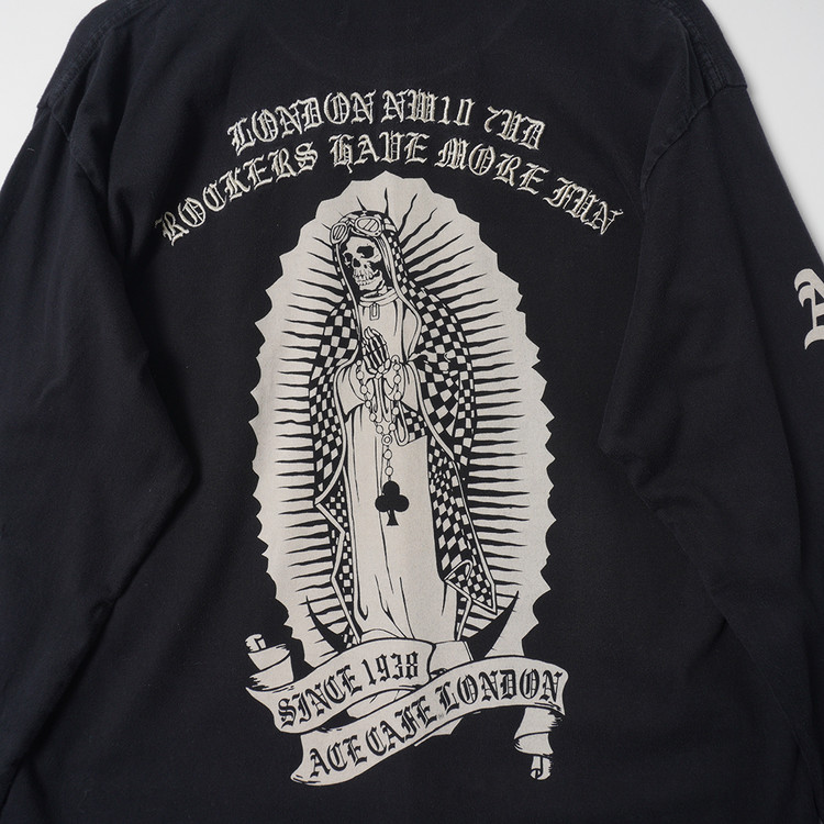 1938년 부터 이어져온 런던의 모터사이클,카 컬쳐, 록큰롤 기반의 커뮤니티 에이스 카페 런던의 프린트 롱슬리브 입니다. 전후면 프린트, 레터링 자수 사양으로 모터사이클/락 문화를 좋아하시는 분께 추천드립니다.
