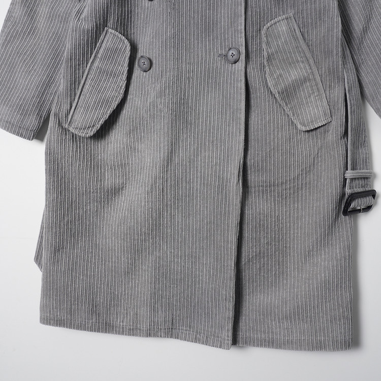 두께감있는 코튼 코듀로이 소재의 트렌치 코트입니다. 워싱과 페이딩에 의한 색감이 멋진 제품으로 일반적인 클래식 트렌치 코트 디자인입니다.안감 늘어짐 존재하나 착용에 문제될 정도는 아니며 그외 특별한 이상없는 양호한 컨디션, 단추방향이 반대여서 여성용으로 추정되나 남성 M, 여성 Free 사이즈 추천드립니다.