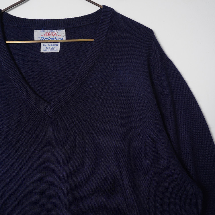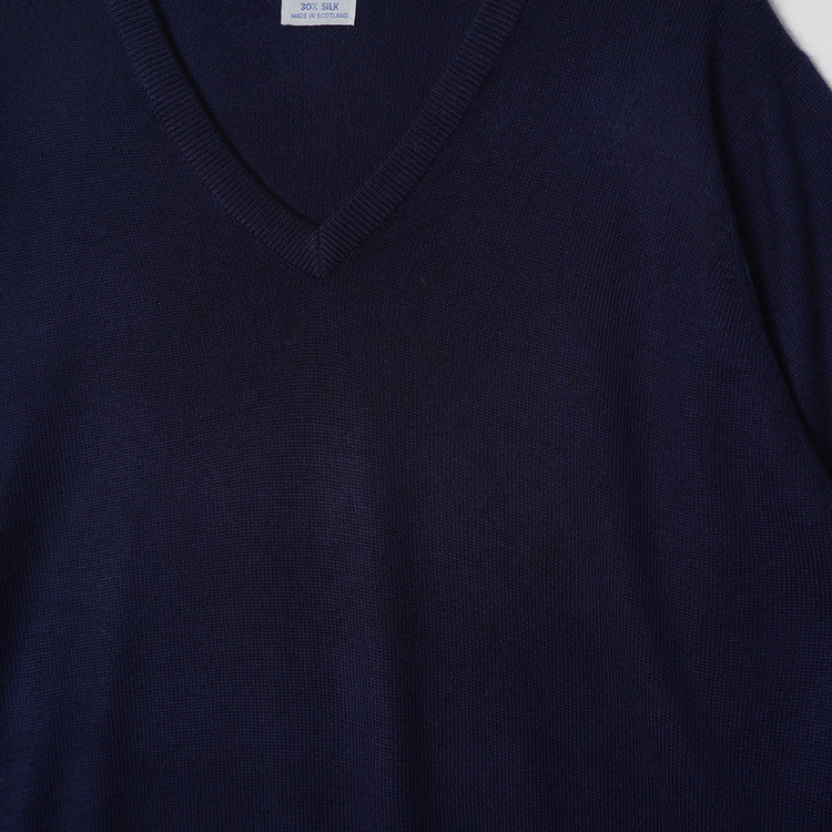 캐시미어와 실크 블렌드 원단으로 매우 부드러운 감촉의 네이비 컬러 브이넥 니트 스웨터입니다. 자연스러운 사용감의 양호한 컨디션 유지중입니다.