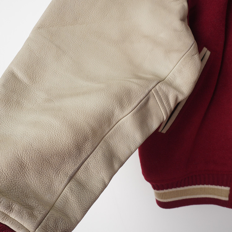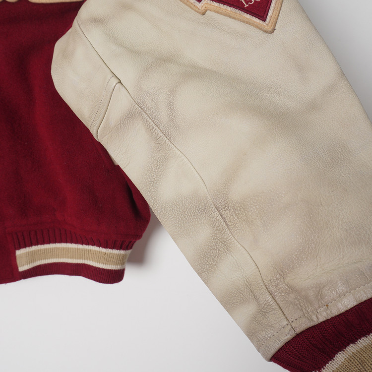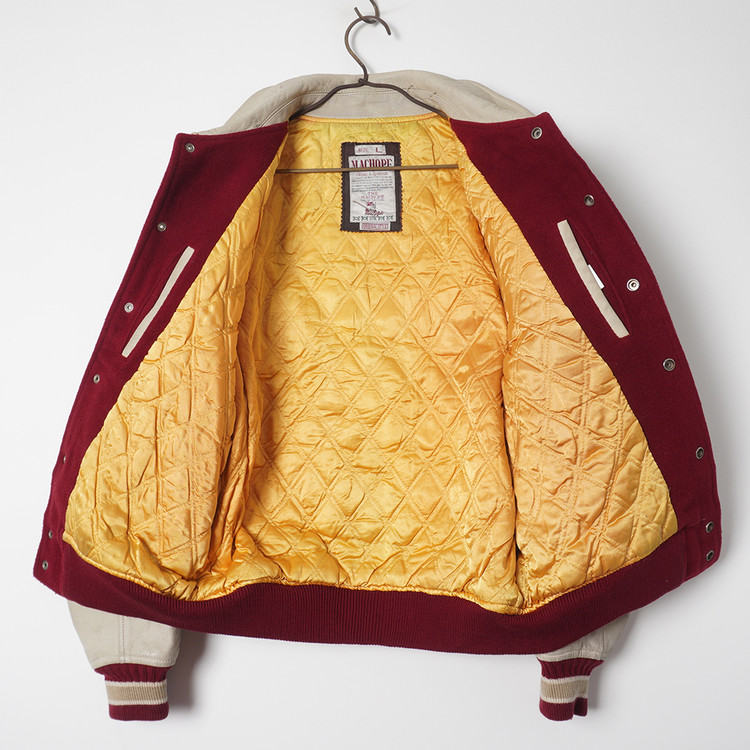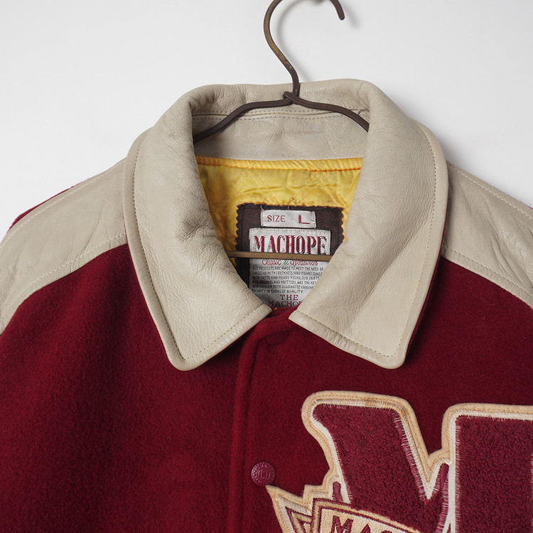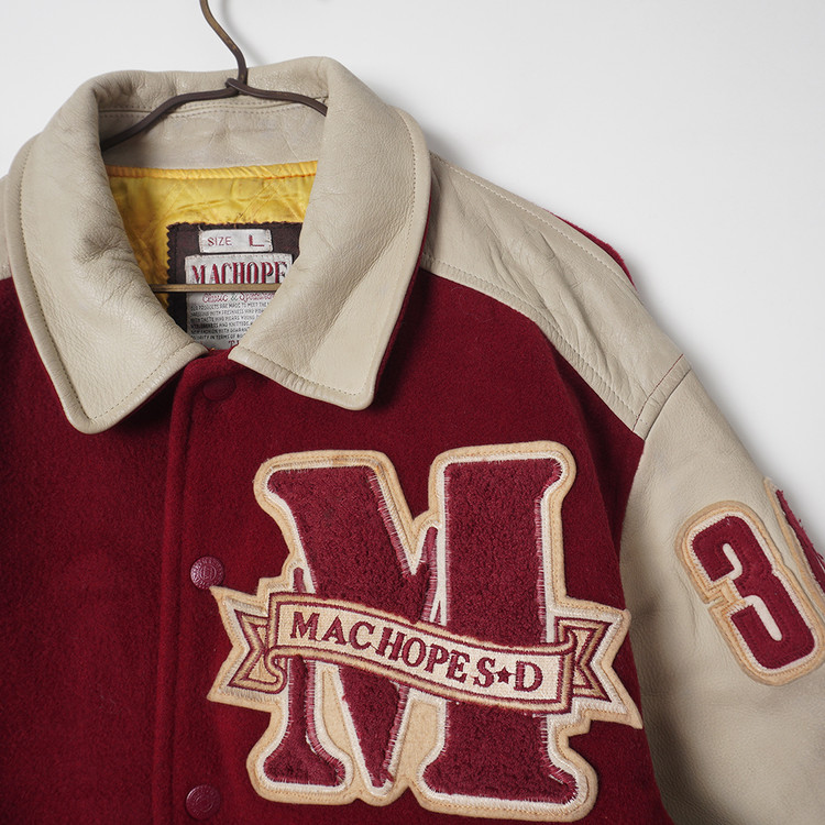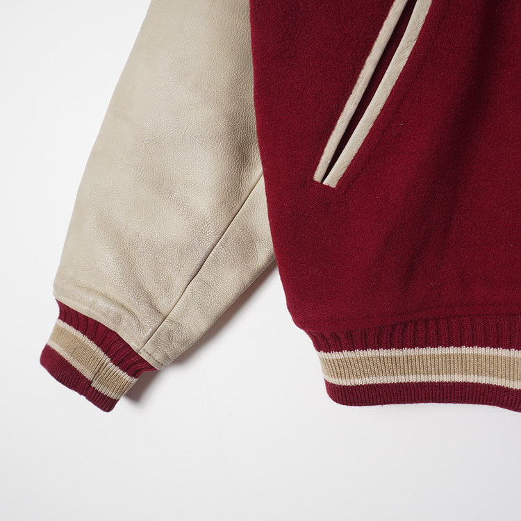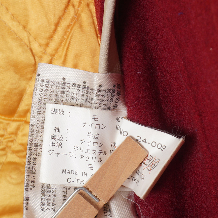 전/후면 패치 사양의 빈티지 바시티 자켓입니다. 소가죽과 울 블렌드 모직 원단이 사용되었으며 특별한 데미지는 없지만 가죽파츠 색상 특성상 사용감에 의한 에이징 존재합니다. (사진참고) 국내 남성 L (100) 사이즈 추천드립니다.