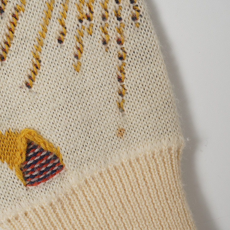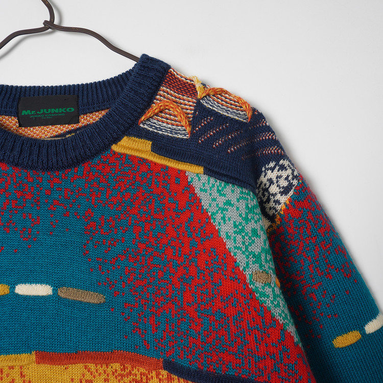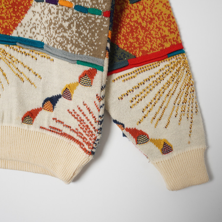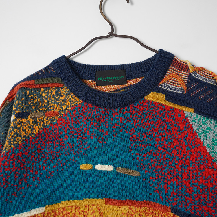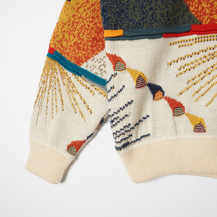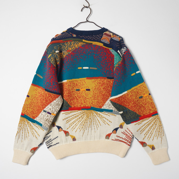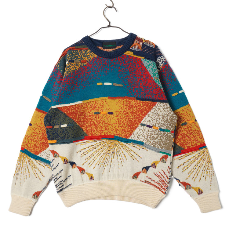 독특한 그래픽과 직조감의 3D 케이블 니트 스웨터입니다. 약간의 스팟성 부분이염 있으나 그래픽, 컬러 특성상 착용에 문제되지않을 정도입니다. 그외 우수한 컨디션