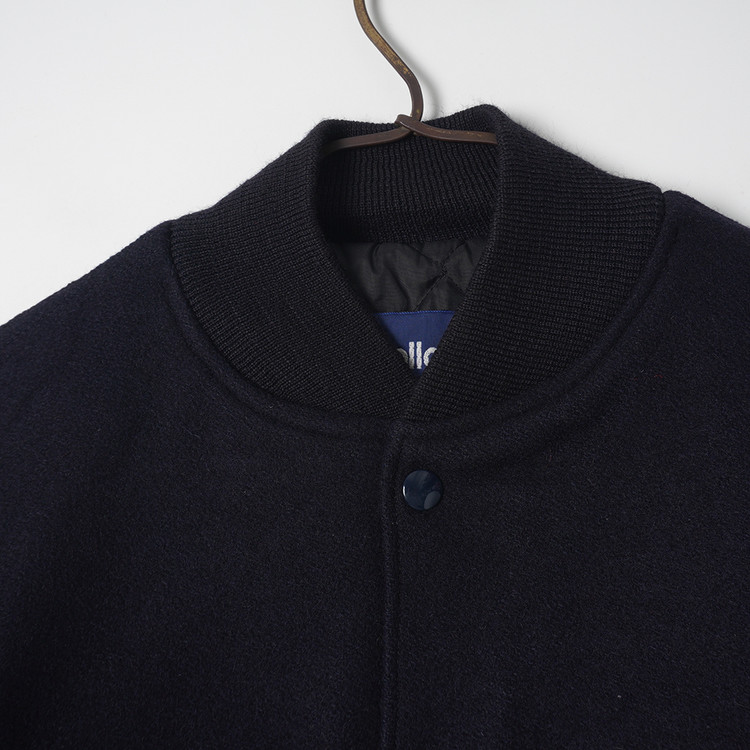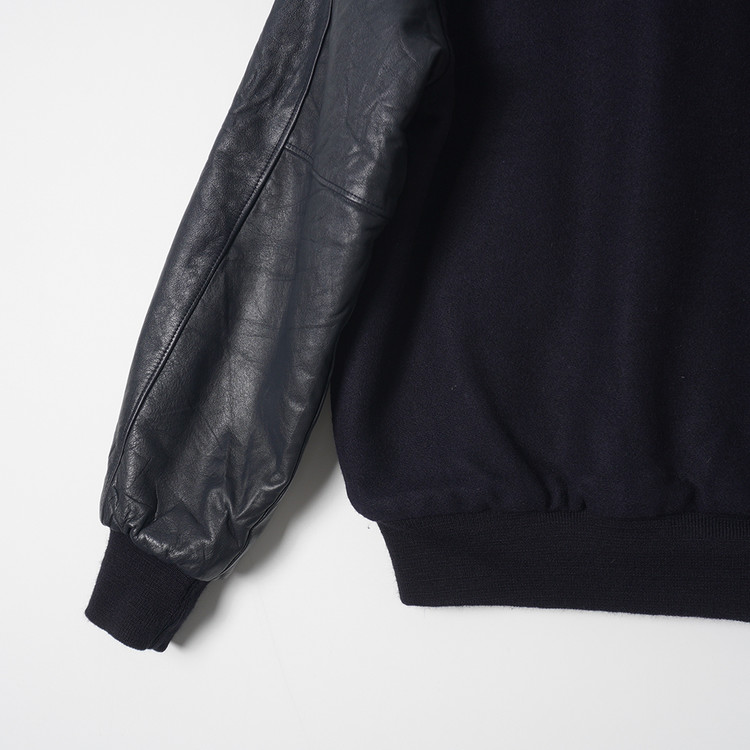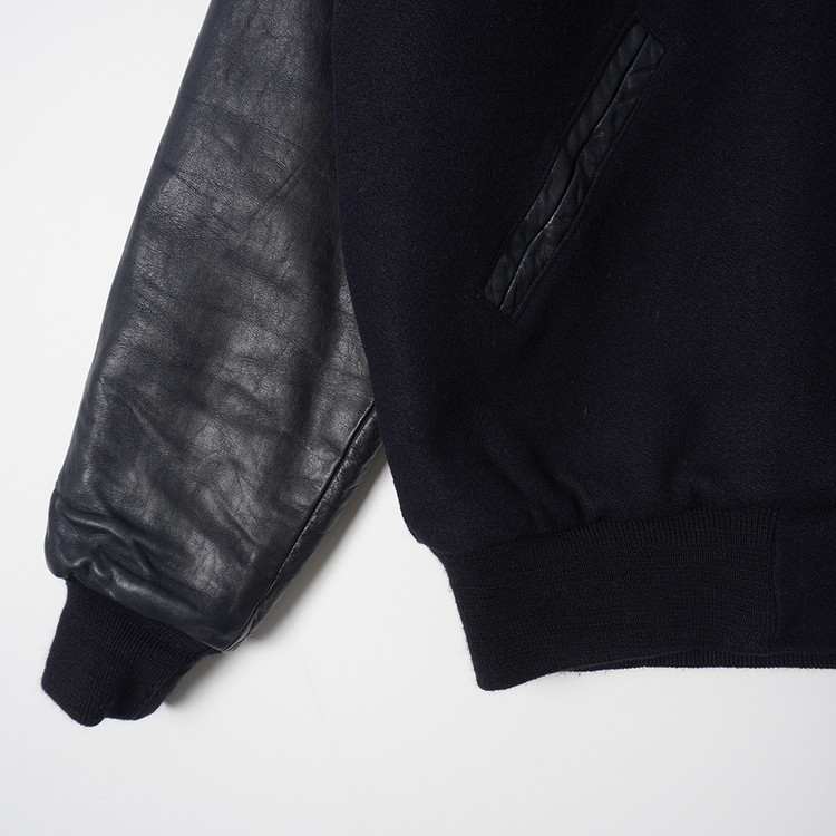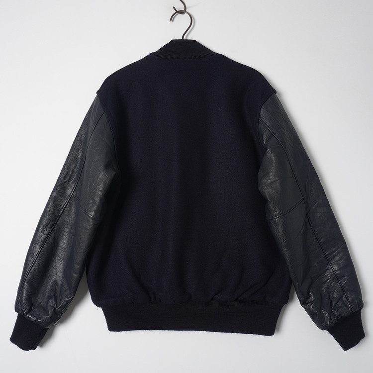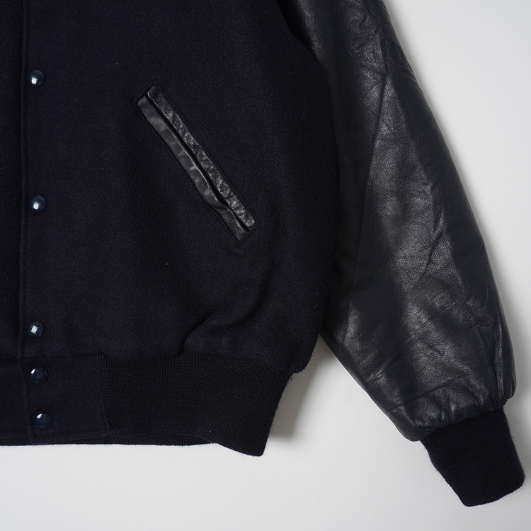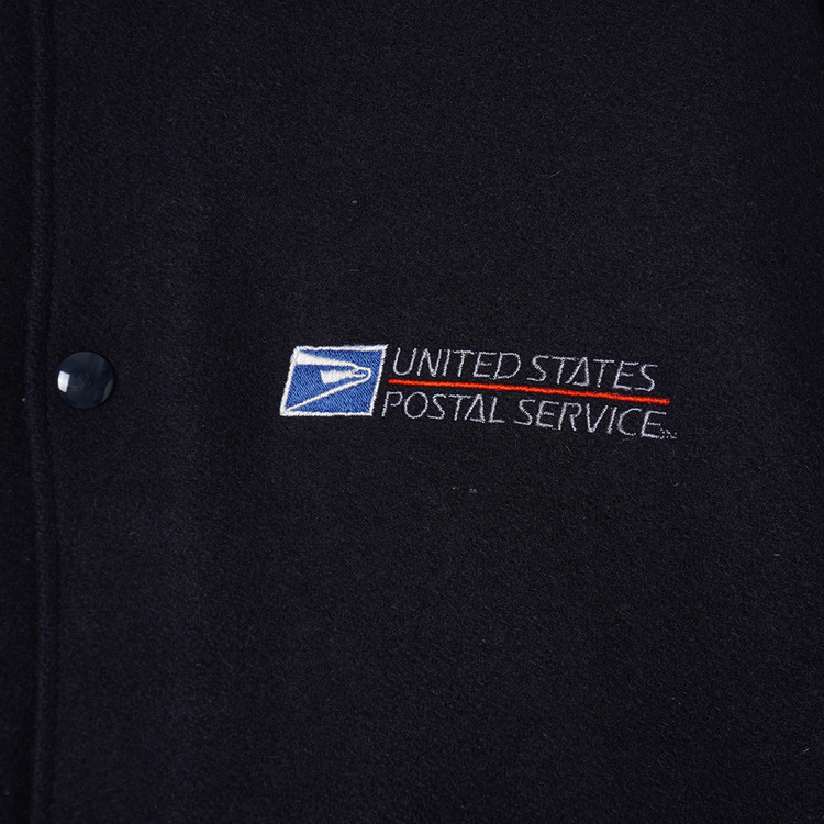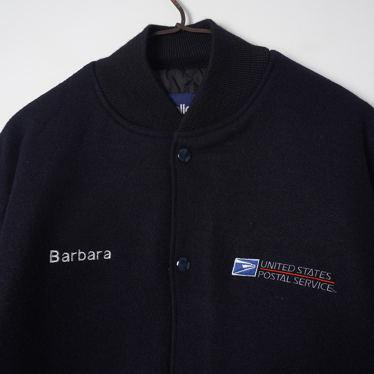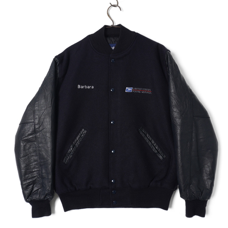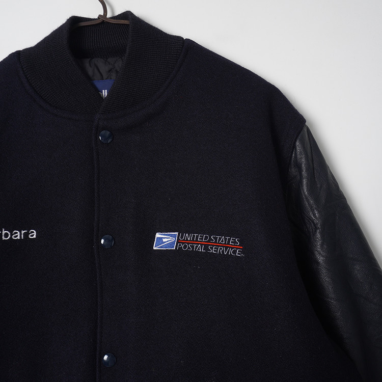 United  States Postal Service (USPS) 자수 소가죽 바시티 자켓입니다. 슬리브 소가죽/바디 울블렌드 모직이 사용된 제품으로 다크네이비 컬러입니다. 사용감 적은 우수한 컨디션, 유니크한 자수의 매력적인 바시티 자켓으로  국내 남성 L 사이즈 추천드립니다.