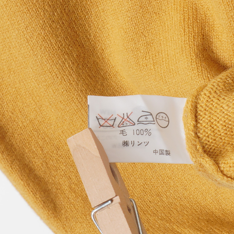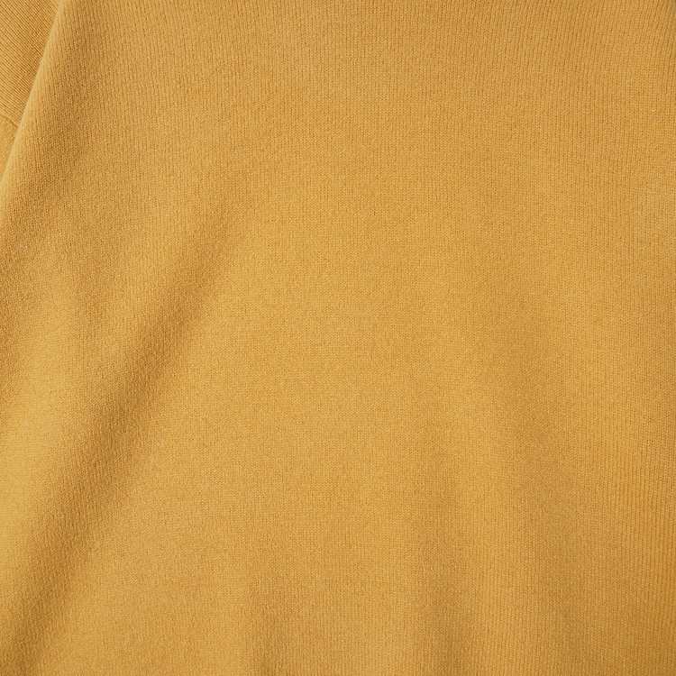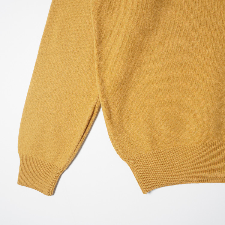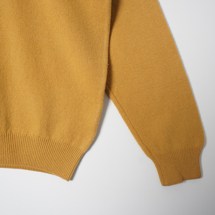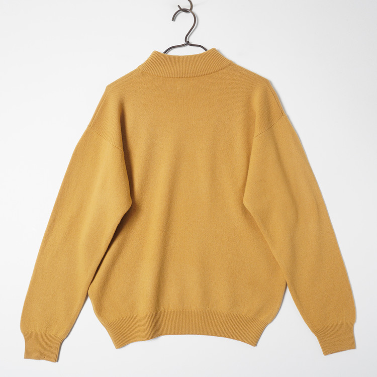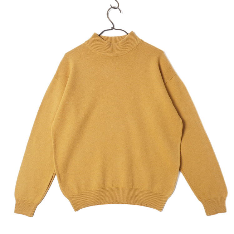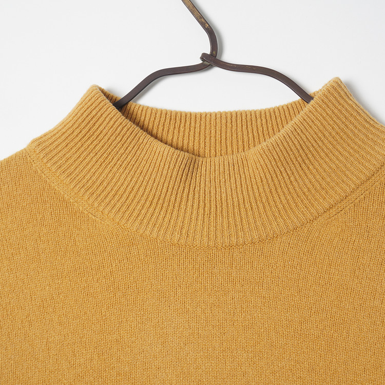 모크넥 스타일의 머스타드 컬러 울 니트 스웨터입니다.