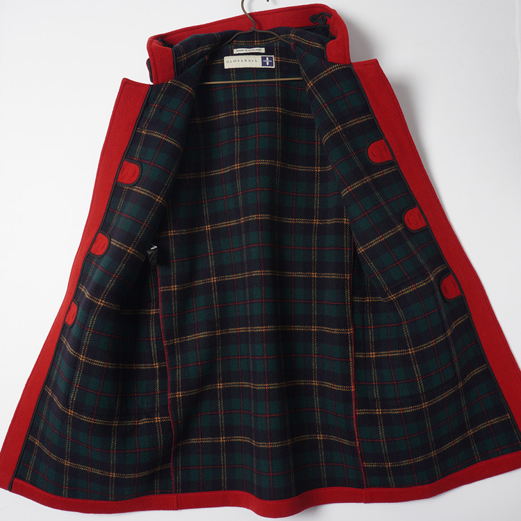 더플코트의 명가 글로버올의 클래식 더플코트입니다. 겨울에 잘어울리는 레드 컬러와 그린 타탄체크 안감의 배색, 두툼한 울블렌드 모직 원단이 사용되었으며 우수한 컨디션 유지중입니다.더플코트 특성상 여성분이 소매 롤업후 오버핏으로 착용해도 좋을듯 합니다.