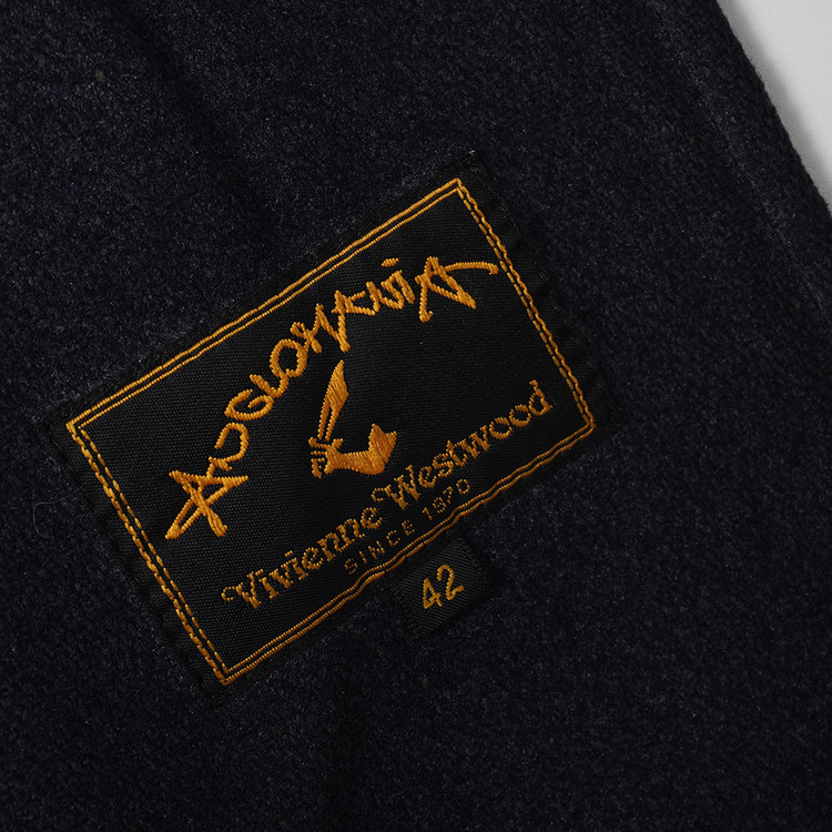 90년대 런칭한 비비안웨스트우드의 앵글로매니아 라인 피코트입니다. 울블렌드 원단이 사용되었으며 사용감에 의한 워싱과 페이딩이 마치 데님처럼 진행된 색감의 제품입니다. 특별한 데미지는 없으나 전체적인 사용감있는 제품입니다. 표기사이즈 42, 국내 남성 S, 여성 Free 사이즈 추천드립니다.