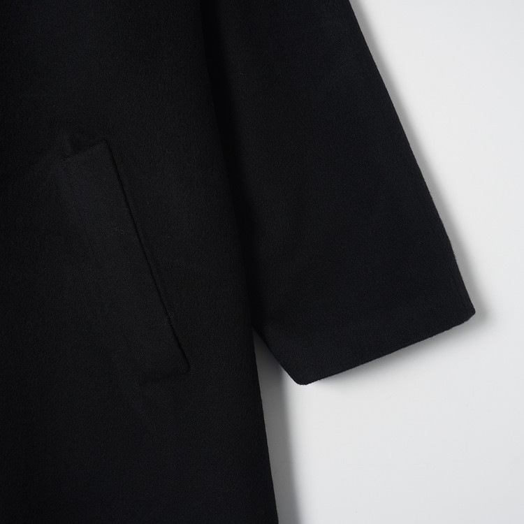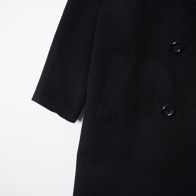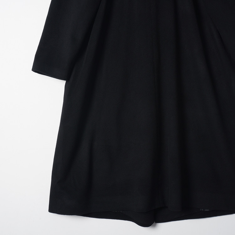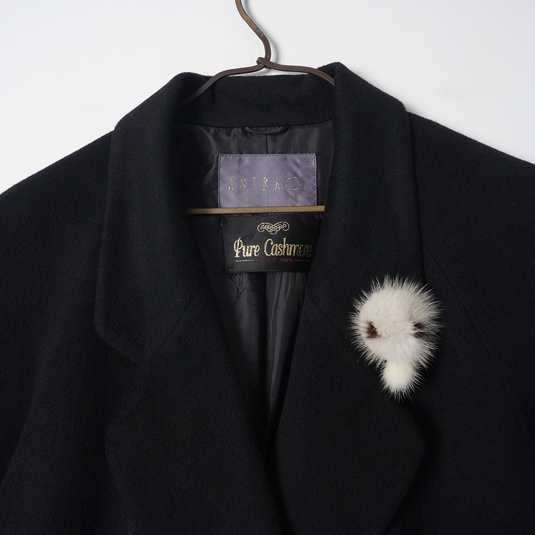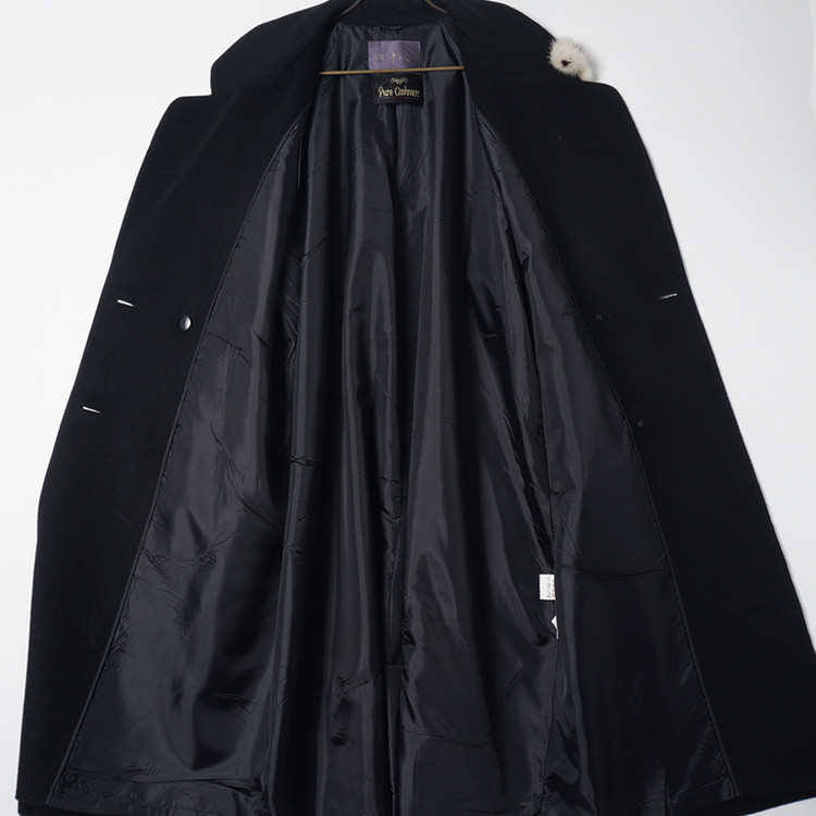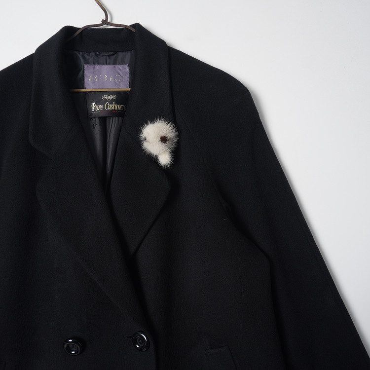 더블브레스티드 형식의 블랙 캐시미어 100% 코트입니다. 발마칸 스타일의 래글런 어깨선, 밑으로갈수록 퍼지는 플레어 느낌의 긴 기장감의 제품으로 사용감 적은 매우 우수한 컨디션입니다. 탈착가능한 퍼 브로치 포함으로 국내 여성 Free 사이즈 추천드립니다.