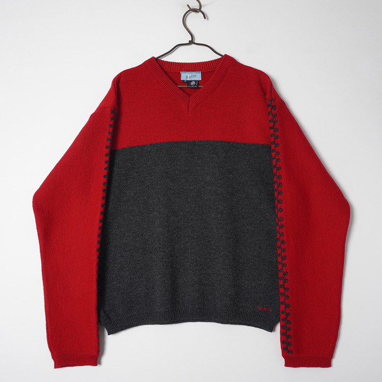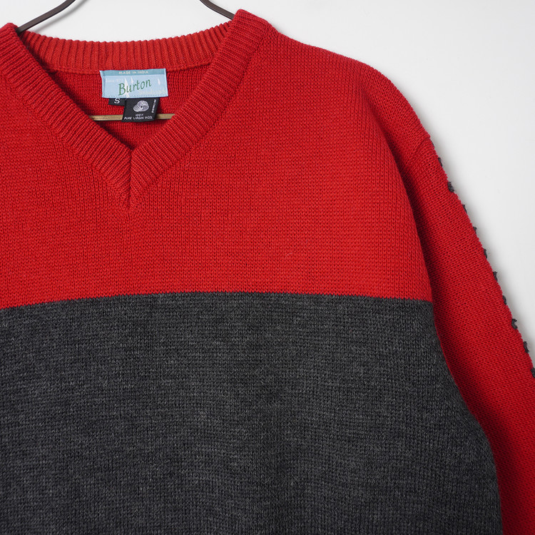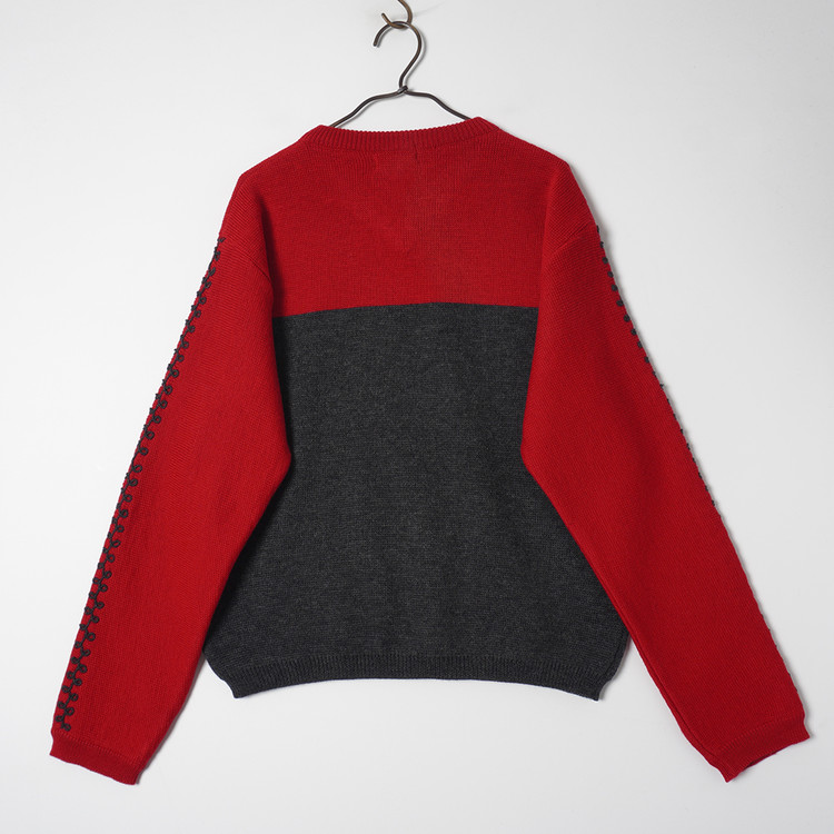양쪽 슬리브 부분 자수 디테일이 멋진 2톤 니트 스웨터입니다. 사용감 적은 우수한 컨디션으로 국내 남성 L 사이즈 추천드립니다.