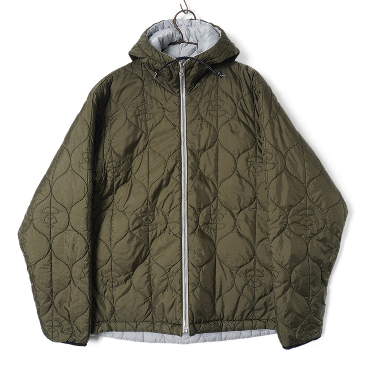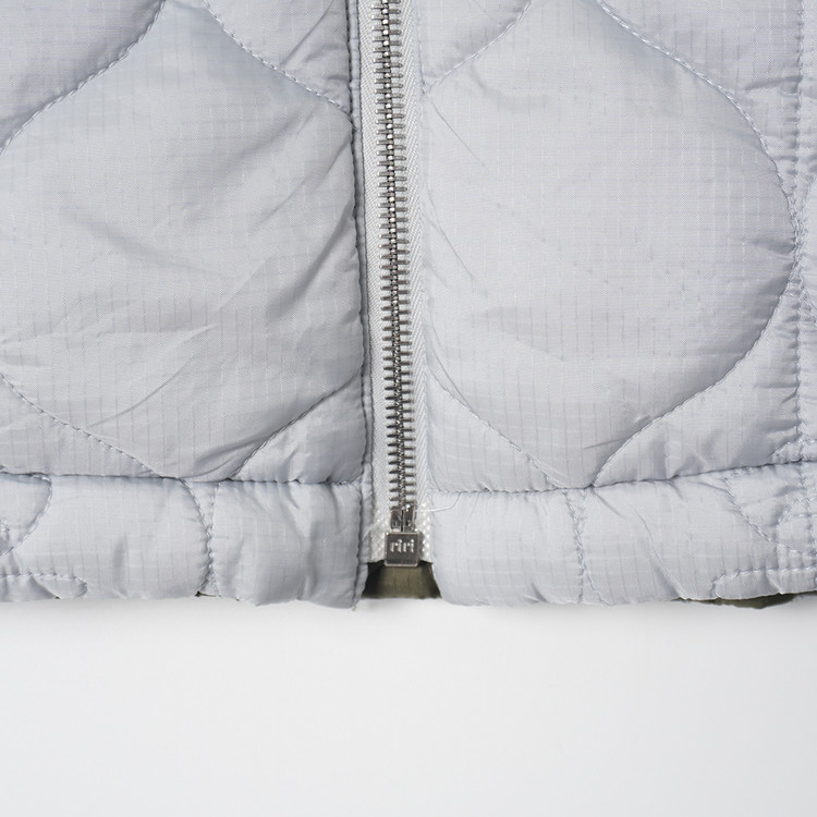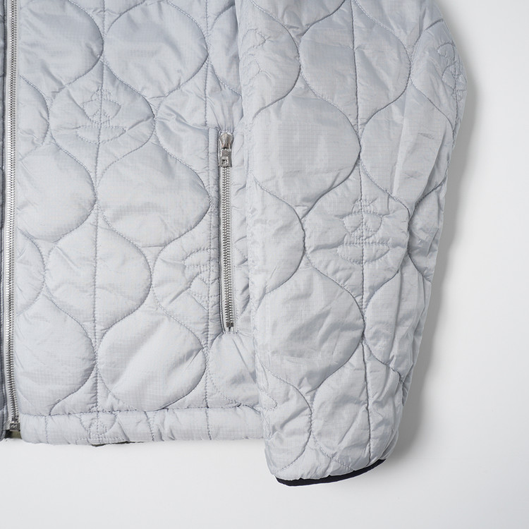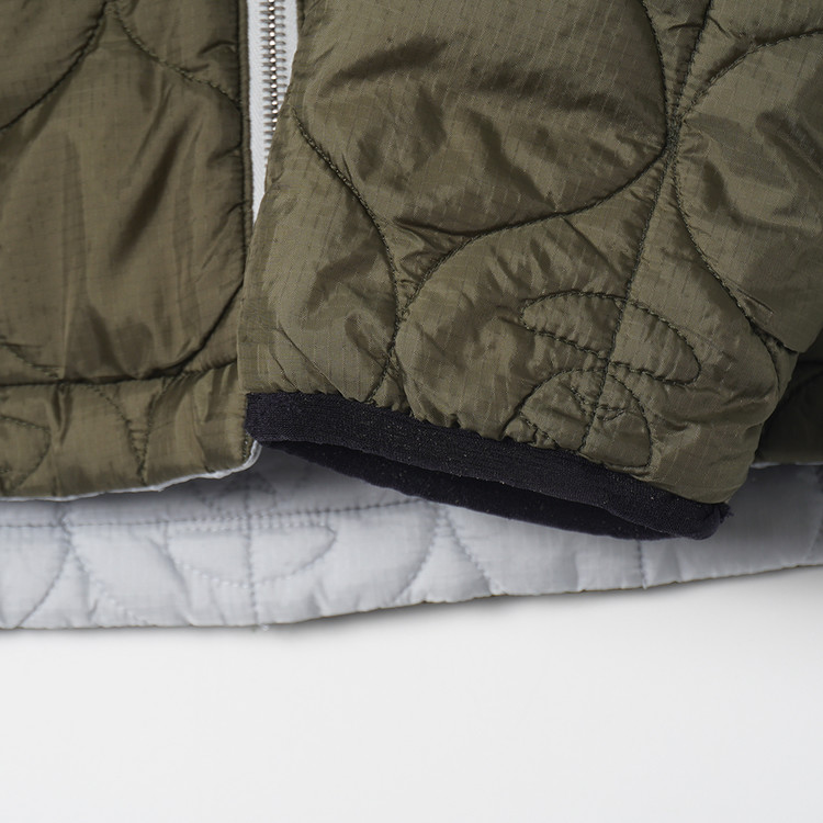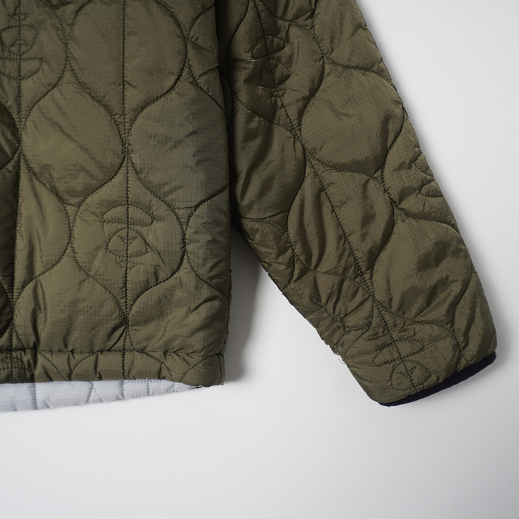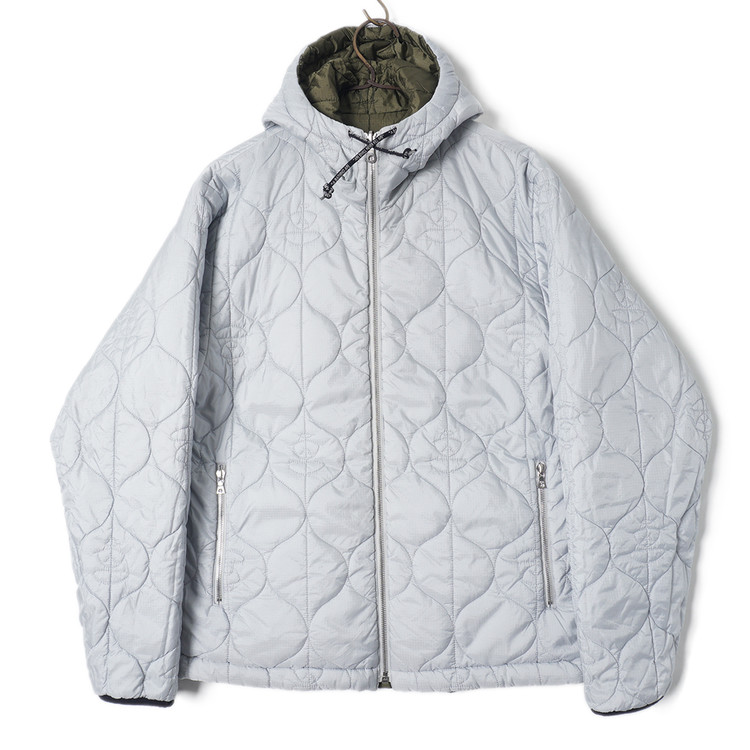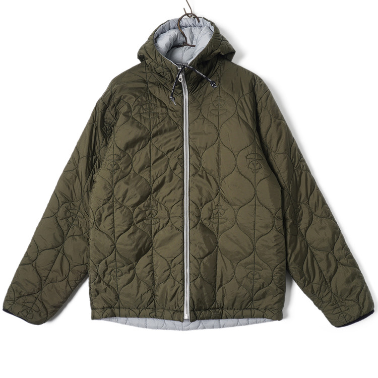 스카이블루그레이/올리브그린 양면으로 착용가능한 퀼티드 후드 자켓입니다. 특유의 퀼트 디테일, 넥 스트랩, 리리 지퍼등이 특징인 제품으로  소매 리브 사용감 외 전체적인 컨디션 우수한 상태입니다. 표기 사이즈 M, 국내 남성 넉넉한 M 정도 추처드립니다.