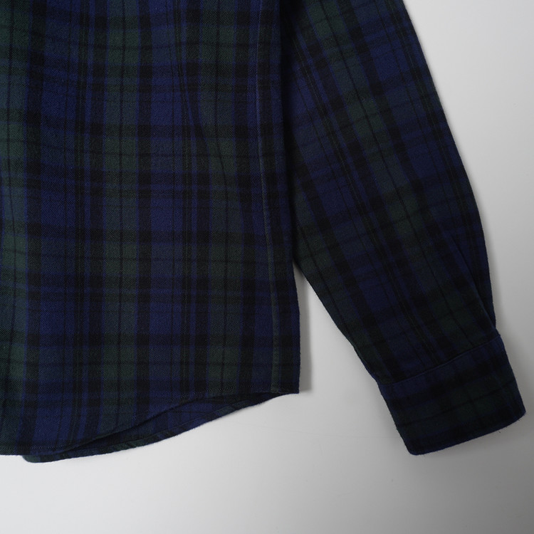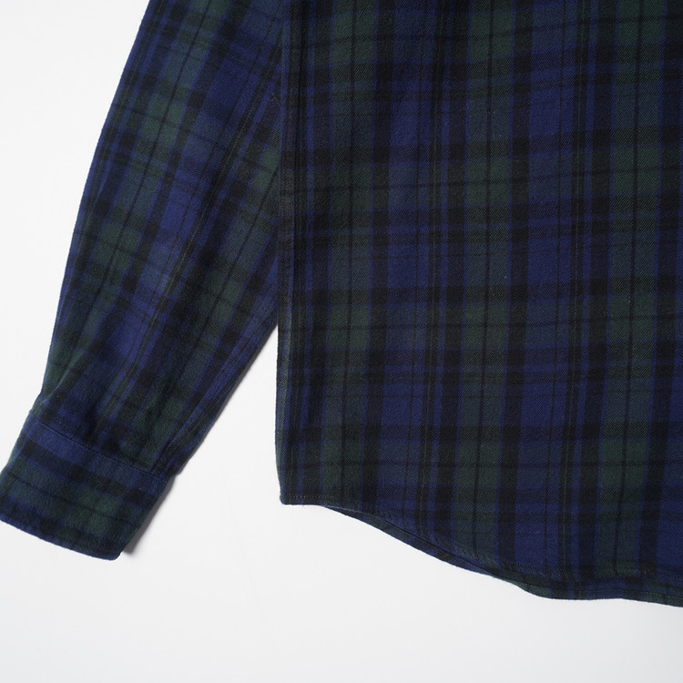 블랙워치 패턴의 체크 플라넬 원단과 특유의 백 프린트, 가슴패치 사양의 버튼다운 셔츠입니다. 사용감 적은 우수한 컨디션으로 국내 L 사이즈 추천드립니다.