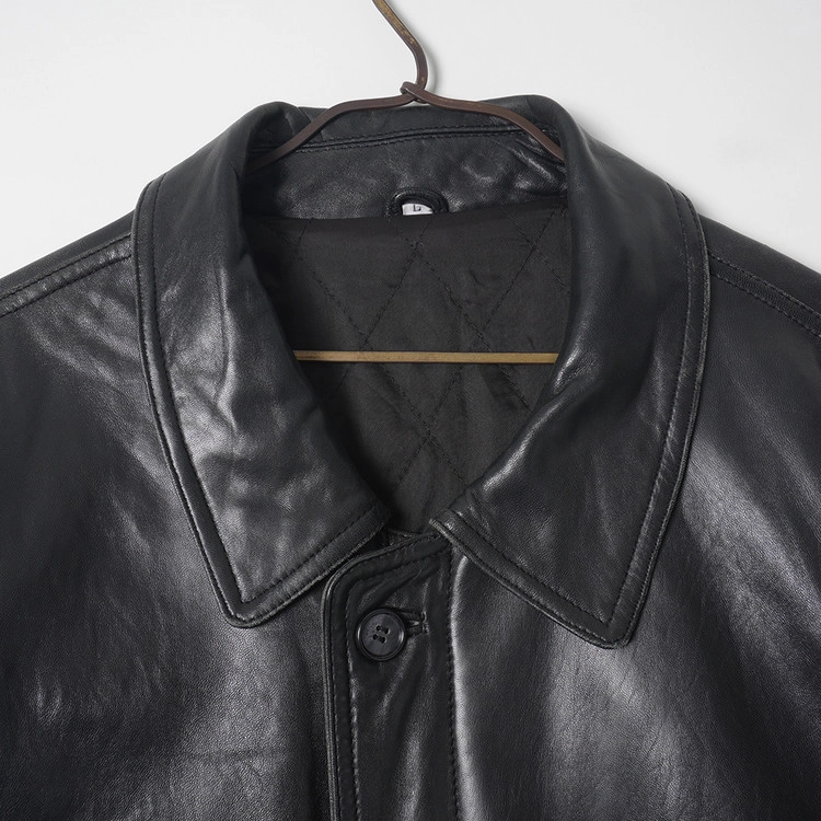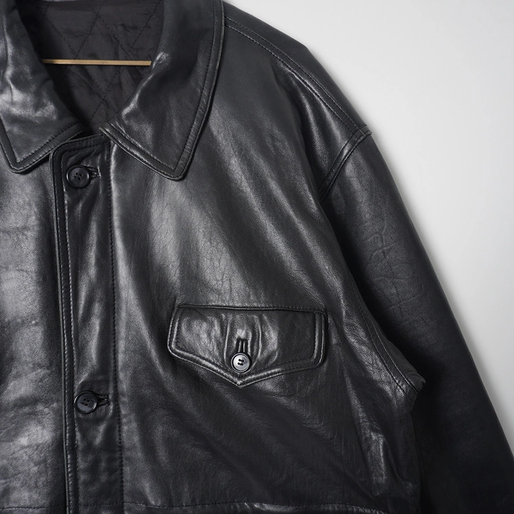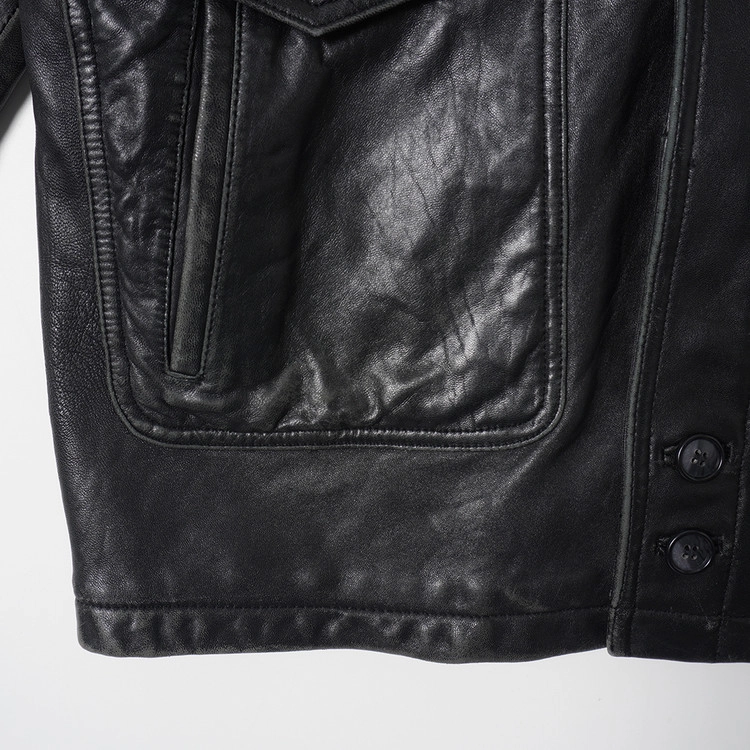 많이 찾아주시는 스탠다드한 스타일의 양가죽이 사용된 넉넉한 핏의 사파리/카코트입니다. 블랙 컬러로 버튼 플라이 여밈방식이며 에이징된 컬러감의 가죽컨디션의 제품입니다. 국내 남성 L, 여성 오버핏 free 사이즈 추천드립니다.