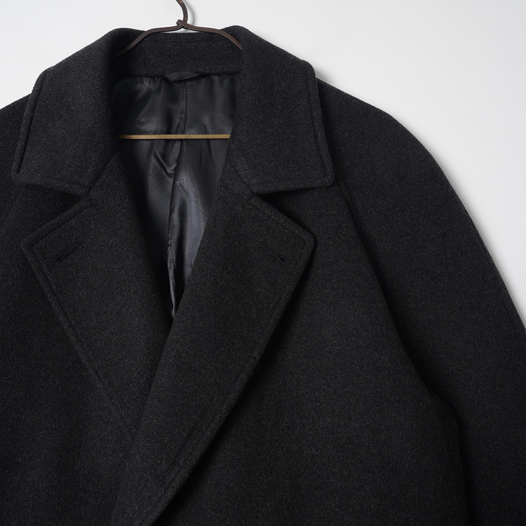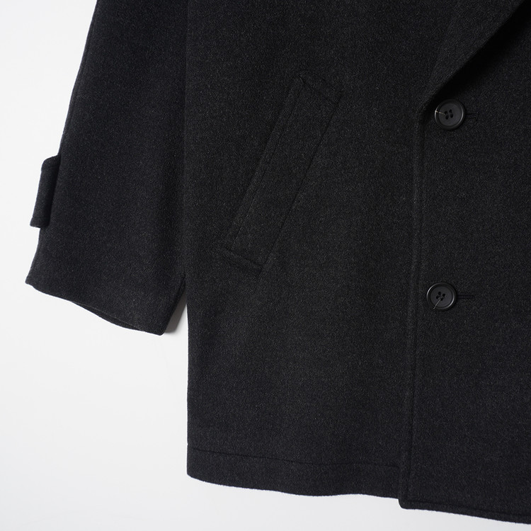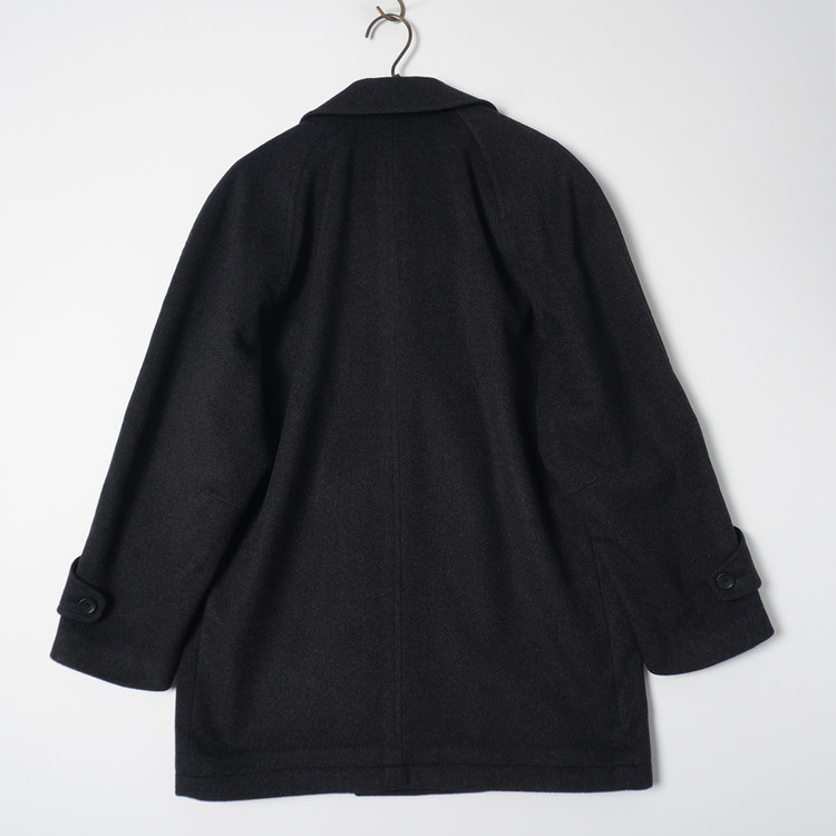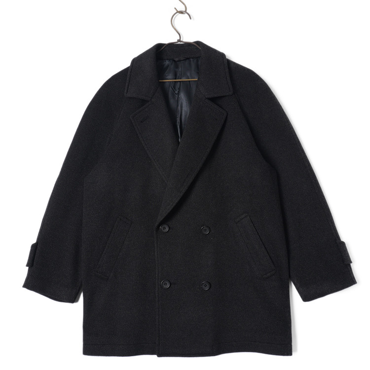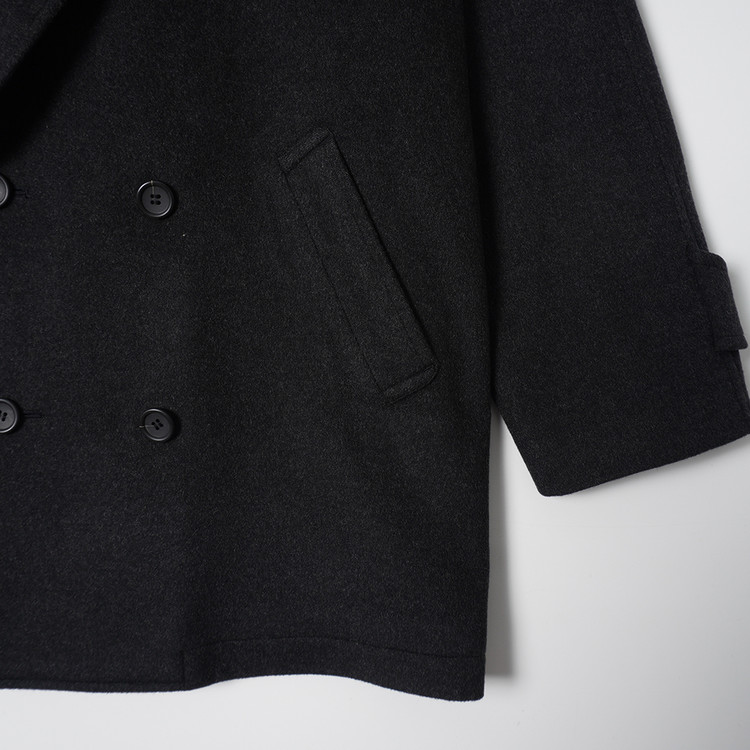 캐시미어 모직원단이 사용된 피코트 스타일의 더블브레스티드 하프코트입니다. 매우 부드러운 촉감과 원단감의 제품으로 국내 남성 M-L, 여성 오버핏 free 사이즈 추천드립니다.
