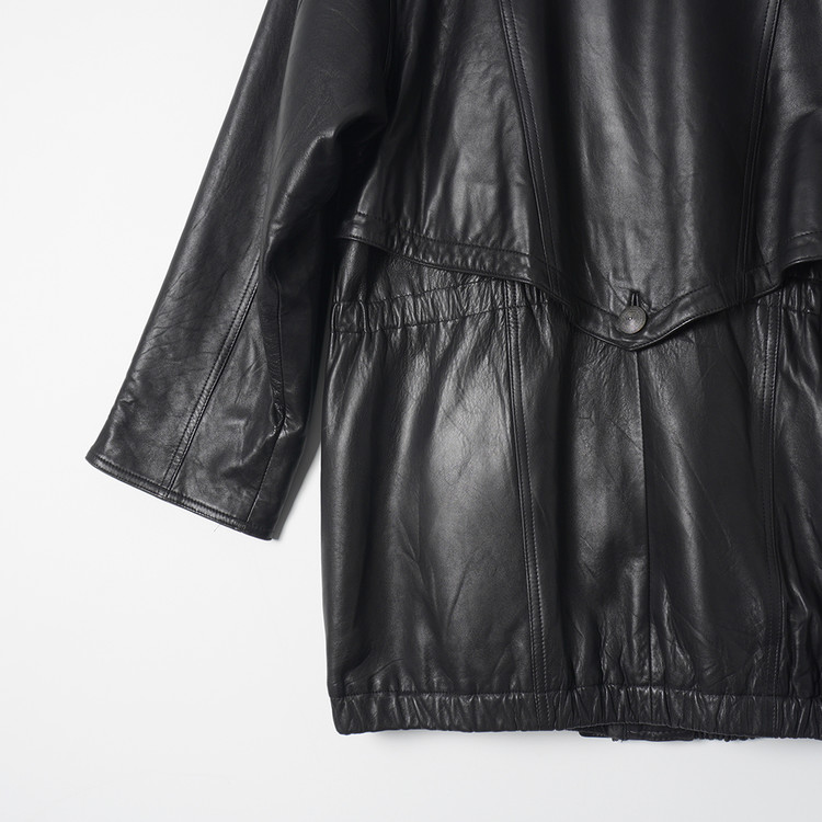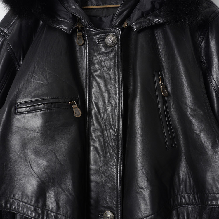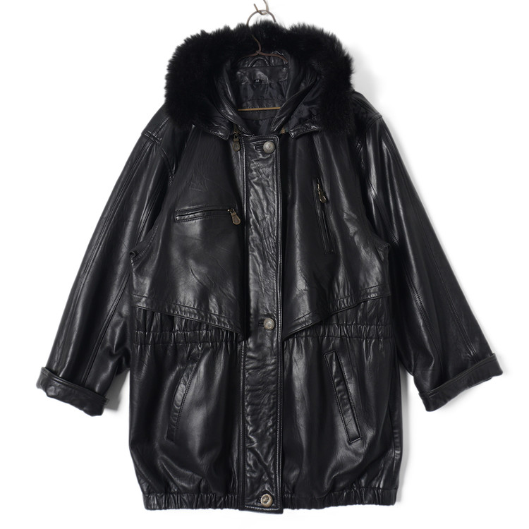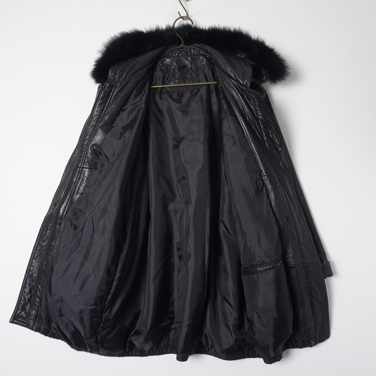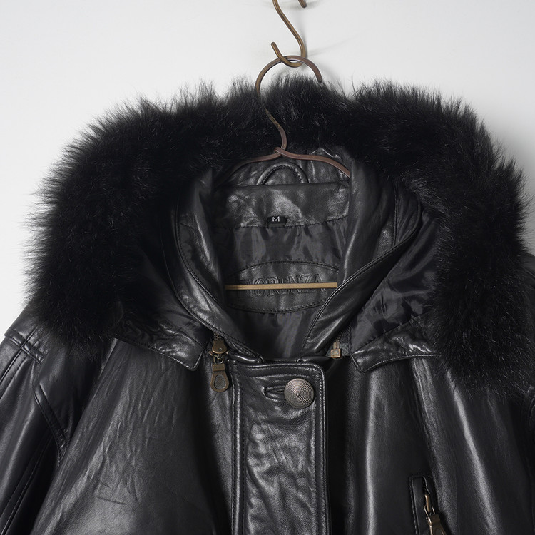 퍼 트리밍이 사용된 탈착가능한 후드가 포함된 여성용 양가죽 사파리/카코트입니다. 기본적인 디자인과는 다르게 조금 다른 디테일이 사용되었으며 소매는 접어서 착용해도 좋은 제품입니다. 표기사이즈 M, 국내 여성 Free 사이즈 추천드립니다.