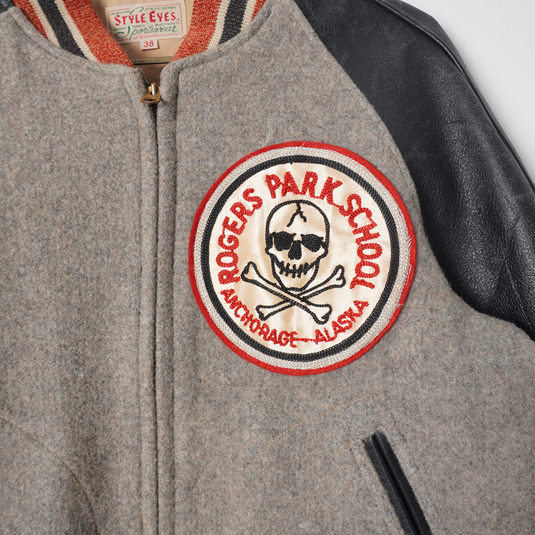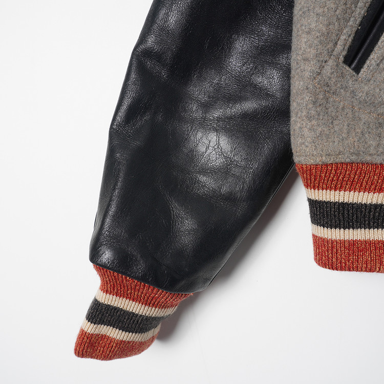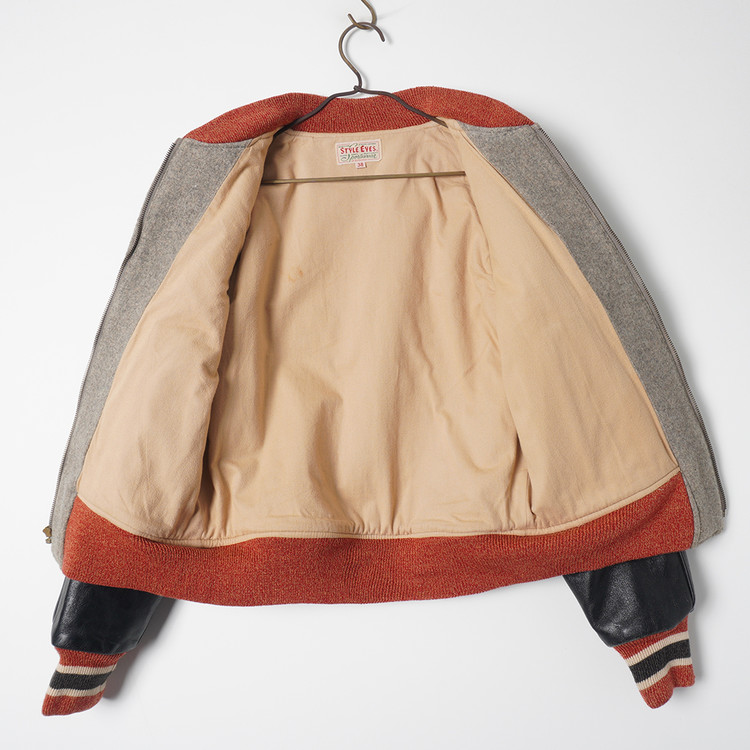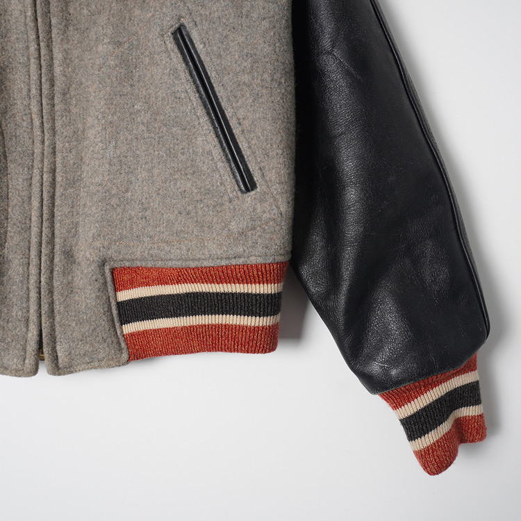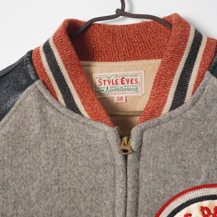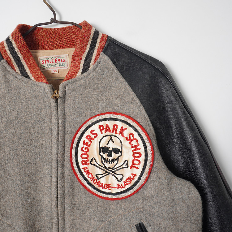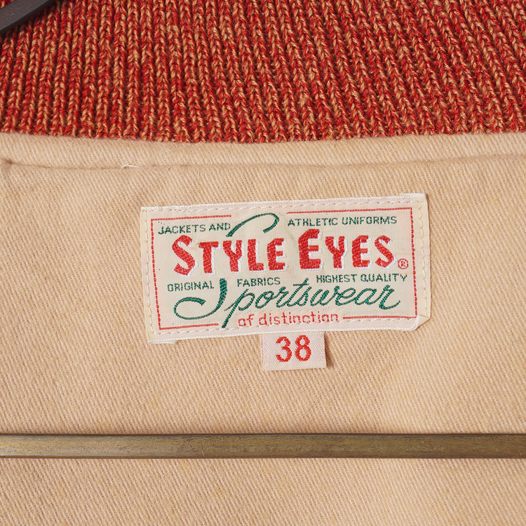 버즈릭슨, 슈가케인, 선 서프 등으로 유명한 아메리칸 캐쥬얼 복각 컴퍼니 토요엔터프라이즈의 스타일아이즈 바시티 자켓입니다. 두께감있는 울블렌드 바디와 래글런 어깨선, 묵직한 소가죽 슬리브가 사용된 제품으로 슬림하고 짧은 기장의 핏입니다. 전체적으로 에이징 있는 컨디션으로 표기사이즈 38, 국내 남성 S-M (93)정도, 여성 free 사이즈 추천드립니다.