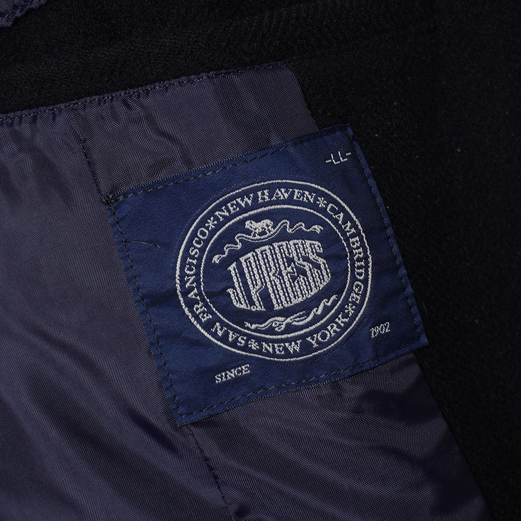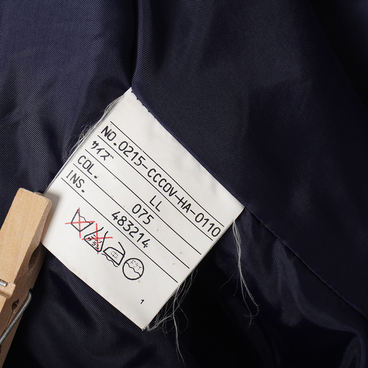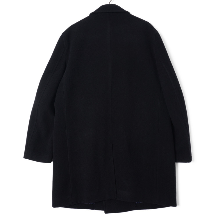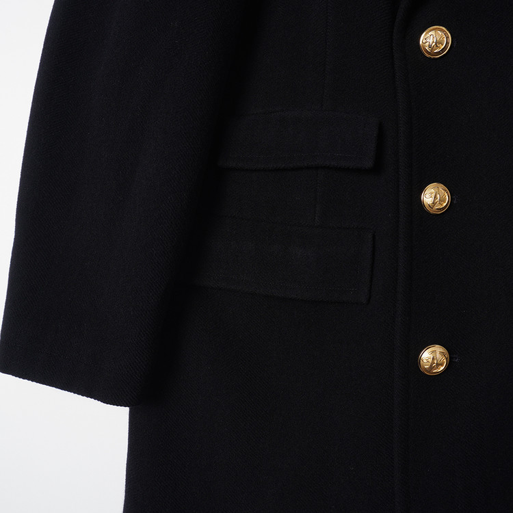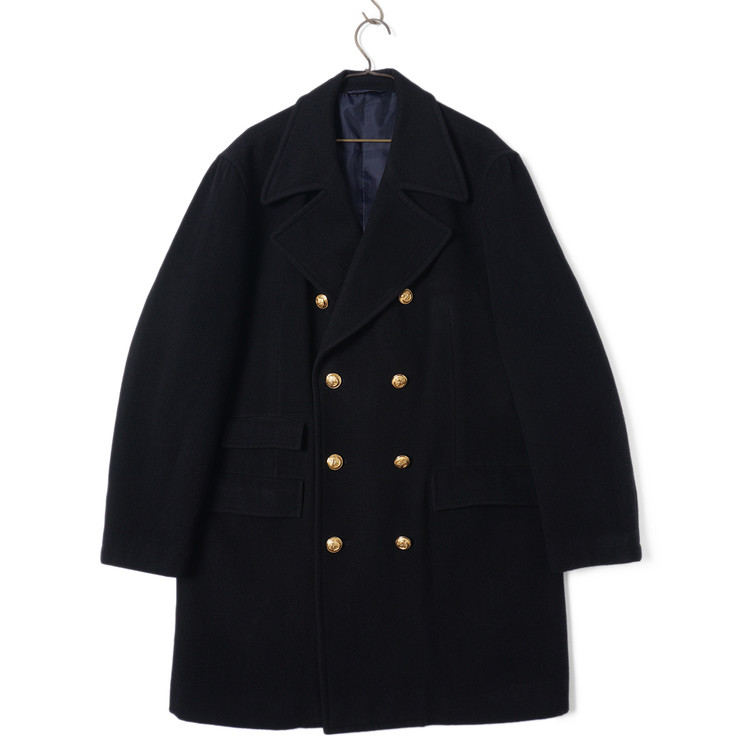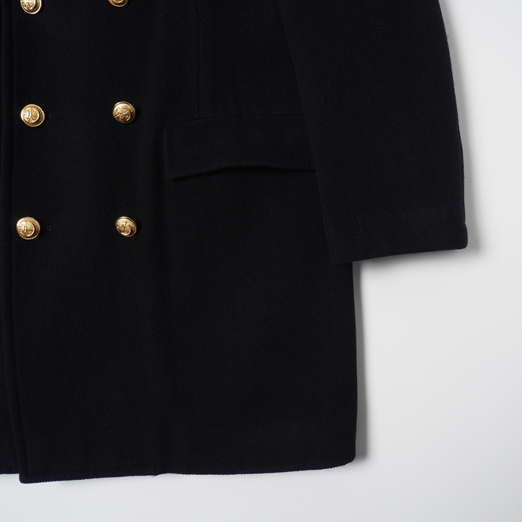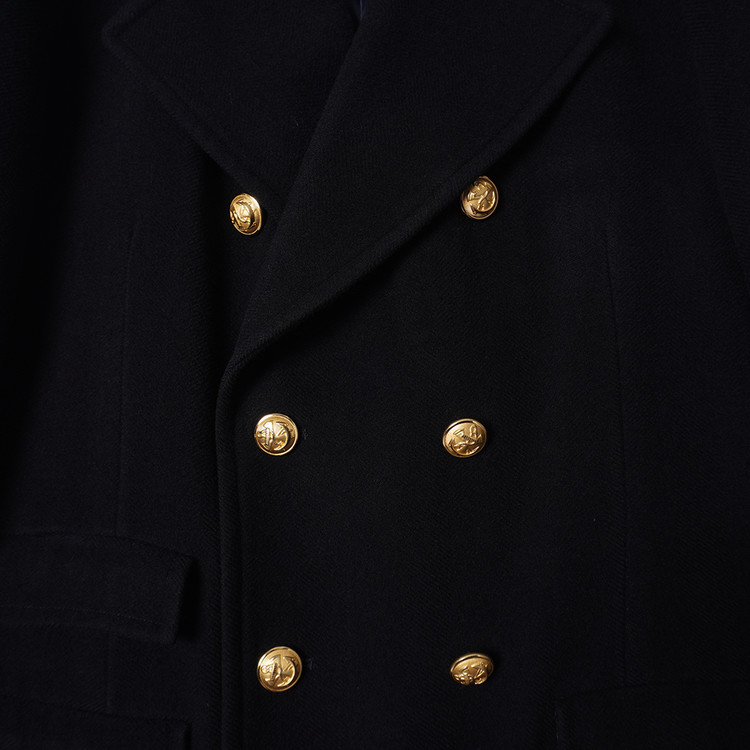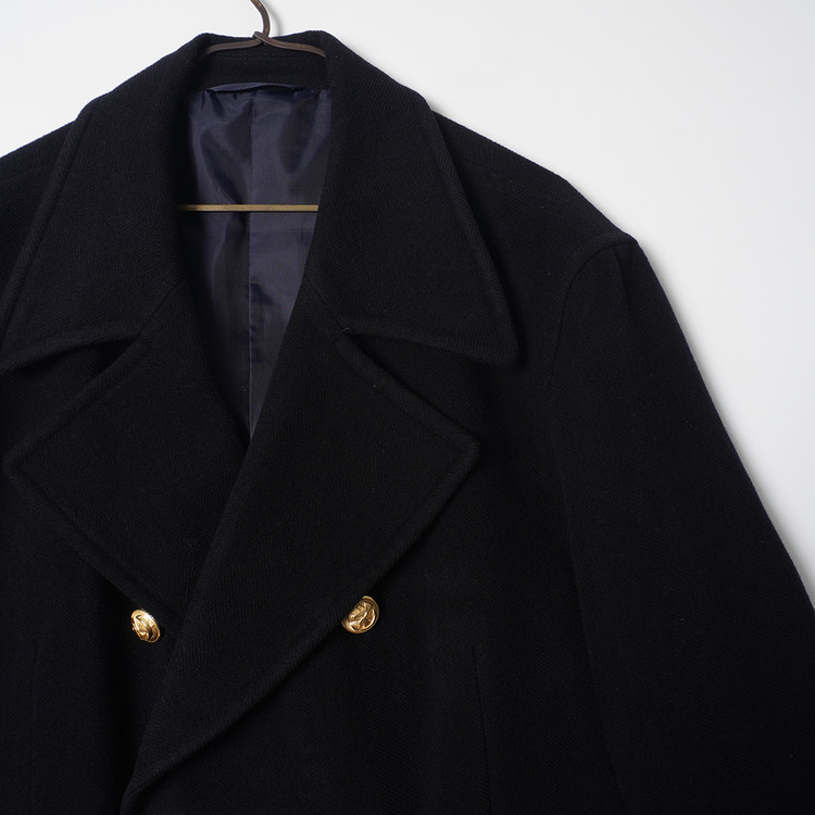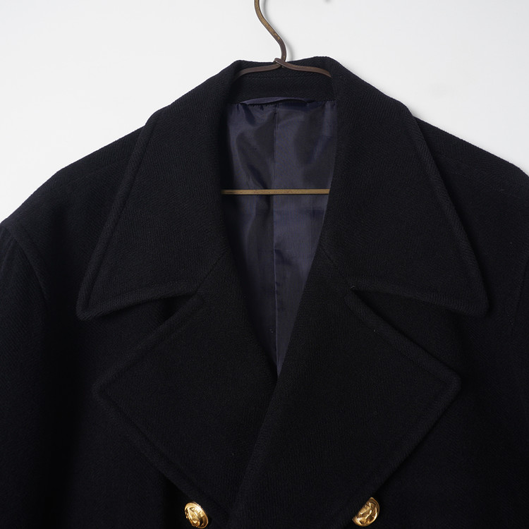 두껍지 않은 울 모직원단이 사용된 블랙컬러의 피코트입니다. 일반 피코트와는 다르게 다소 긴 기장의 제품으로 금장버튼과의 조화가 멋진 제품입니다. 표기 사이즈 LL, 국내 남성 XL 사이즈 추천드립니다.